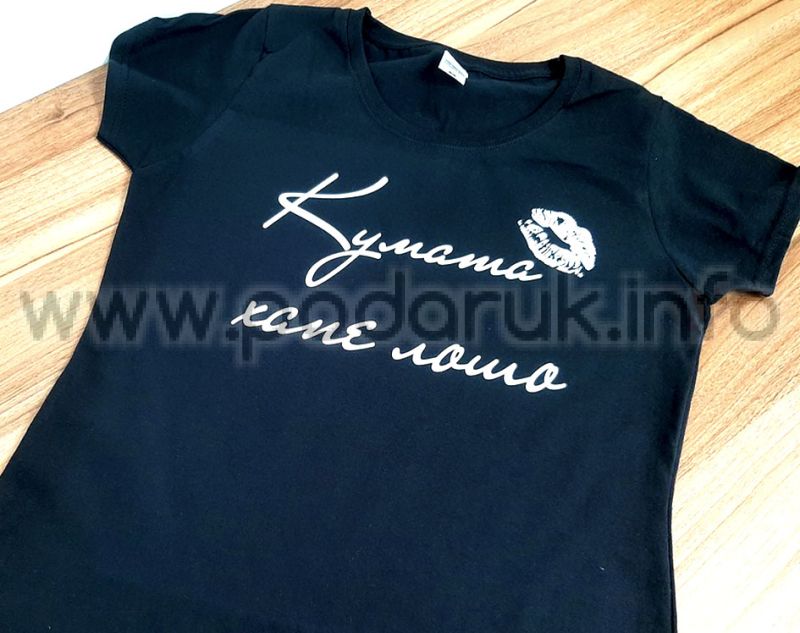 Тениската с надпис 'Кумата хапе лошо' и елемент целувка за моминско парти предлага стил и комфорт.