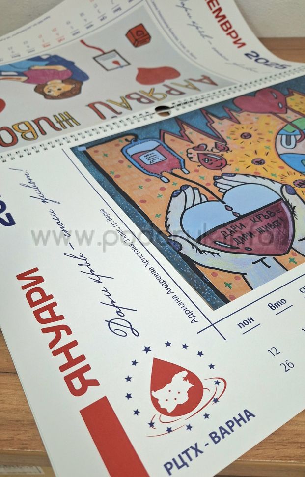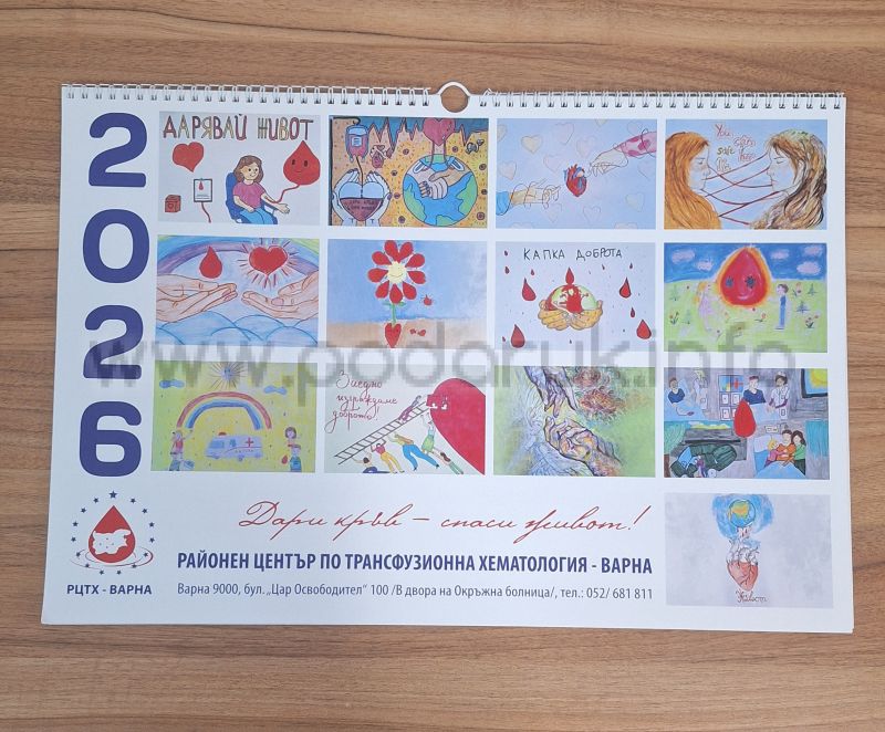 Отпечатан върху висококачествена 170 гр. гланцова хартия. Завършен с метална спирала и кукичка за окачване на стена. Отбелязани в червено са всички почивни дни и официални празници.