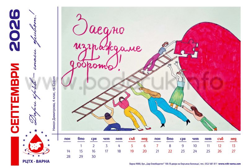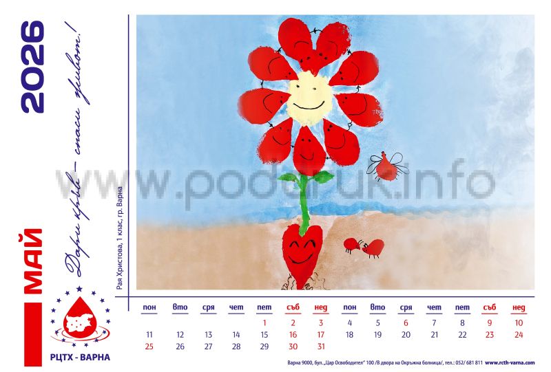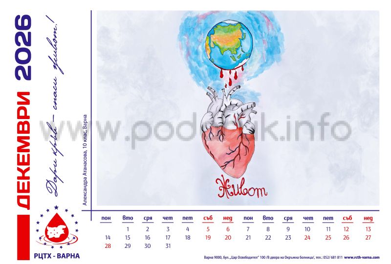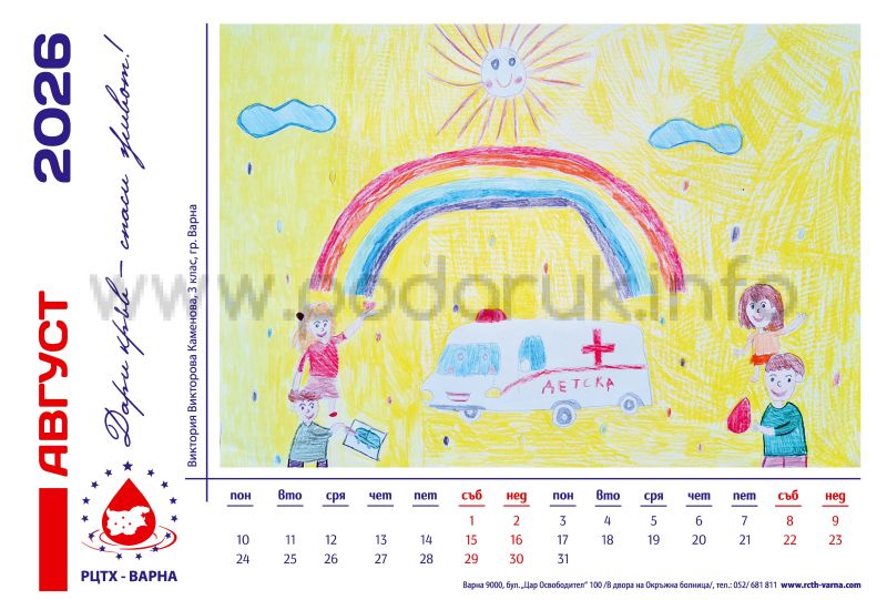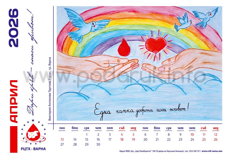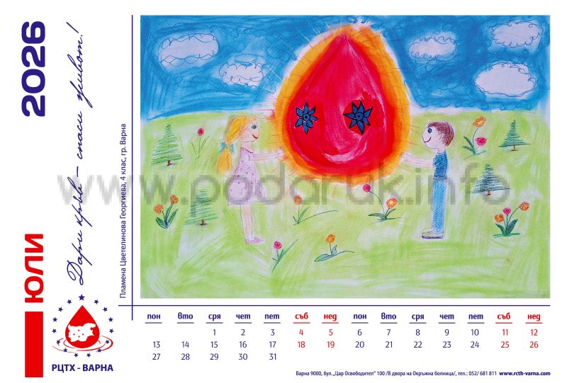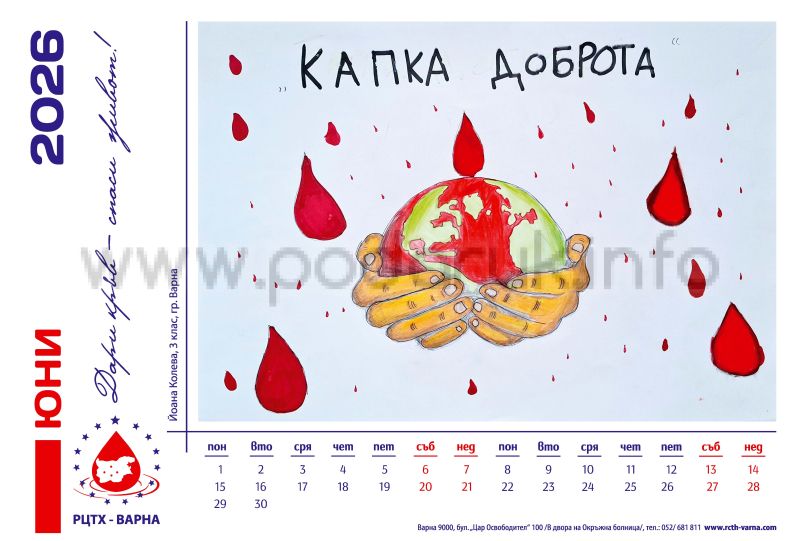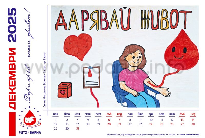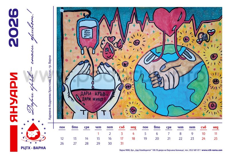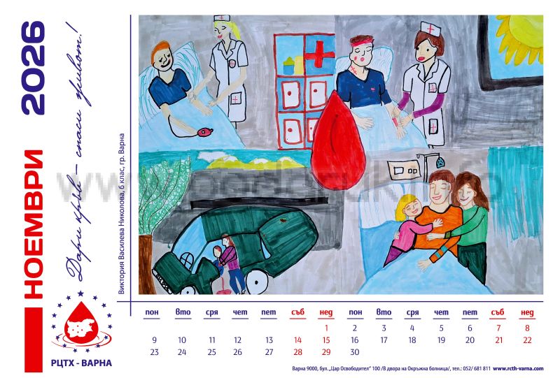 Календарът съдържа 13 прекрасни детски рисунки на тема „Капка доброта“, всяка от които носи силно послание за човечност, съпричастност и надежда. Чрез изкуството на децата календарът цели не само да привлече внимание, но и да докосне сърцата на хората. Основната му мисия е да стимулира кръводаряването като акт на доброта и споделена отговорност, както и да мотивира всеки от нас да бъде по-добър, по-съпричастен и по-отворен към нуждите на другите – всеки ден, капка по капка.