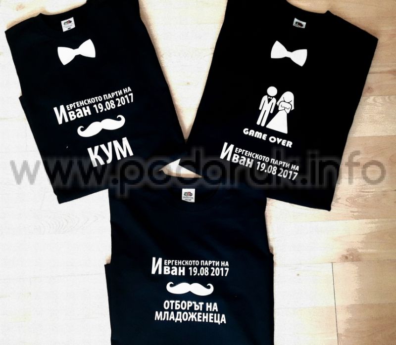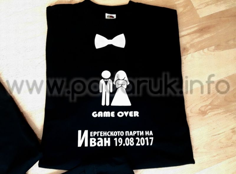 Тениска за ергенско парти с надпис GAME OVER, име на младоженеца и дата
