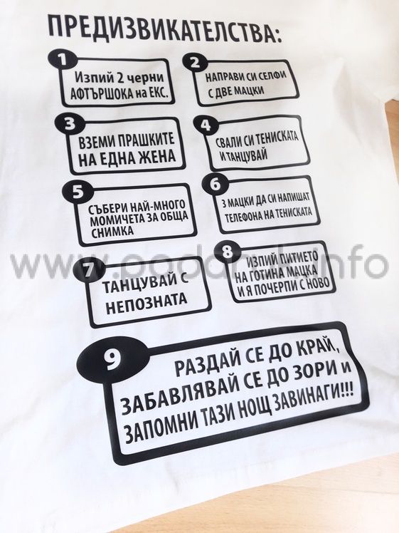 Тениската с щампа "Предизвикателства" е идеалният аксесоар за ергенско парти, който ще подпали атмосферата със забавление и вълнение. Със своите интересни предизвикателства отпечатани на тениската, тя не само ще зареди енергията на събитието, но и ще насърчи участниците да се забавляват и да създадат незабравими спомени. Изработена от висококачествени материали, гарантиращи удобство и стил през цялото парти.