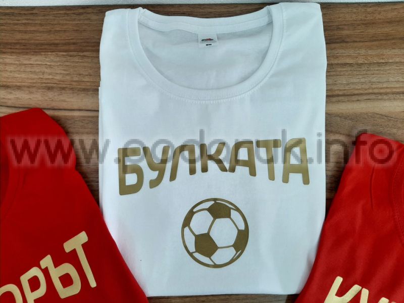Тениската с надпис Булката и елемент футболна топка за моминско парти предлага стил и комфорт.