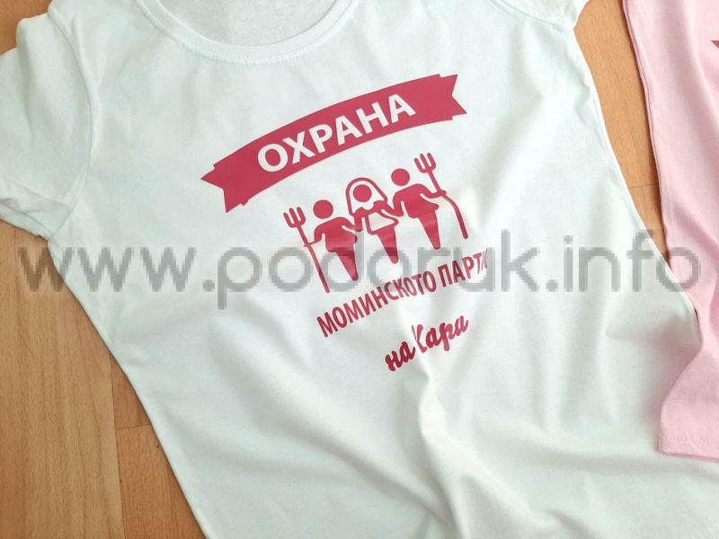 Тениската с надпис Охрана за моминско парти предлага стил и комфорт.