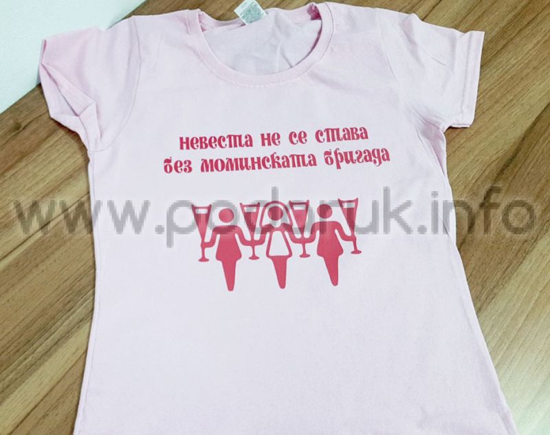 Тениската с надпис Невеста не се става без моминската бригата - за моминско парти предлага стил и комфорт.